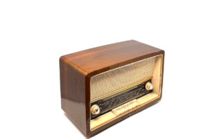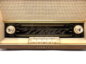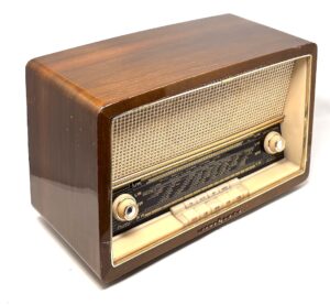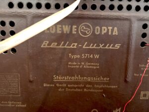 Como hemos explicado en una entrada del blog con la historia de Loewe, Loewe lanzó muchos modelos de esta serie «Bella». Algunas tenían un frontal de madera maciza, pero esta Loewe Opta Bella Luxus tiene el formato más habitual de la época: Una forma rectangular con el frontal de tela cubriendo el altavoz, encima del cristal de dial.