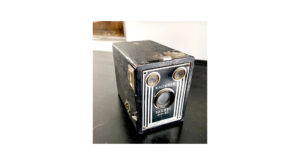 Se trata de una cámara de fotos de tipo «caja de metal» de estilo vertical y una línea «art-deco» en el panel frontal.