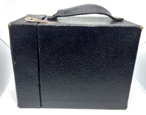 Notas sobre el estado de la cámara: El recubrimiento de simil de piel está en buen estado. Le falta uno de los cierres laterales de metal (que no afecta en absoluto a la cámara) y se pueden observar huellas de oxidación en los demás elementos mecánicos. Teniendo en cuenta la antigüedad de la cámara (en torno a 100 años!) , está en un buen estado, como se aprecia en las fotografías.