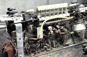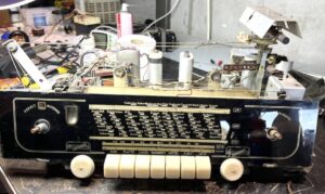 El interior era el propio de una radio que seguramente se guardó en los años 80, con la llegada de algún aparato más «moderno». Hubo que engrasar de nuevo la antena giratoria que estaba trabada, reformatear condensadores, y poner un nuevo condensador en paralelo en la entrada. Se sustituyeron las bombillas del dial, y la válvula EM80 (el ojo mágico) que estaba agotada. Tras la limpieza y ajuste de los mecanismos, volvió a proporcionar una excelente sintonización y una calidad de sonido realmente buena.