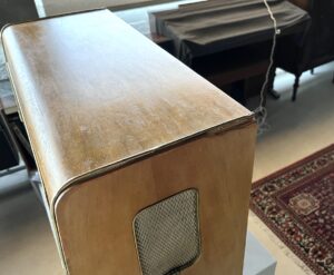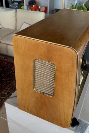La radio la compramos en Alemania hace unos 10 años. Desde que llegó a nuestro taller, ha sido una radio especial para nosotros. La hemos cuidado con cariño. La parte de madera externa la hemos tratado de nuevo, para que recuperase su color y los los barnices originales. Una esquina (en la parte superior lateral derecho, bajo el adorno de cobre) ha tenido que se reconstruido con masilla. Estéticamente es muy llamativa.