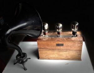 Para escucharla, es necesario conectarla a un altavoz de alta impedancia o a auriculares, ya que no cuenta con altavoces internos. Por este motivo hemos seleccionado este magnífico altavoz Starvox de la época. Starvox-Radio Cie, de Paris fue una compañía de los años 20 que ceso su actividad en 19312