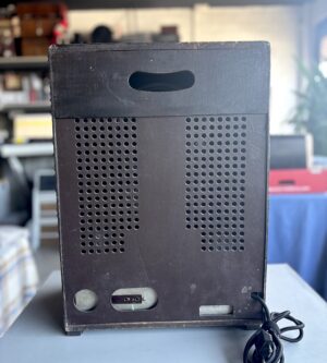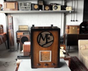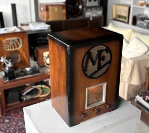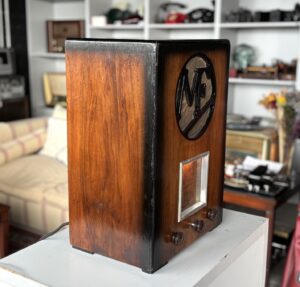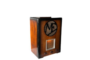 La radio Manufrance MF10 es un elegante receptor de sobremesa de válvulas fabricado en Francia en 1937. Refleja el refinamiento técnico y estético de finales de los años 30. Construida en un sólido mueble alto de madera, todavía sigue la estética de las radios de capilla pre-guerra, con una amplia ventana de dial iluminada. La rejilla del altavoz, integrada en el frontal con el famoso logo MF de la marca, completa un conjunto sobrio pero con gran presencia decorativa.