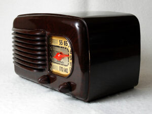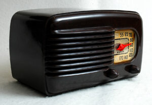 Esta radio Motorola 50X1 es un hallazgo inusual. Una radio de 1940, de 80 años, que está en un estado impecable como se aprecia en las fotos, funcionando correctamente, y que destaca por su diseño de formas redondeadas, que ya supera el tipo de diseño «machine age» más sobrio que había hasta entonces.