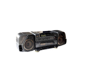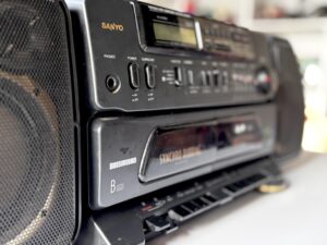 El equipo es grande, imponente para los radiocassettes de la época. Es la versión que Sanyo hizo de los BoomBox americanos.