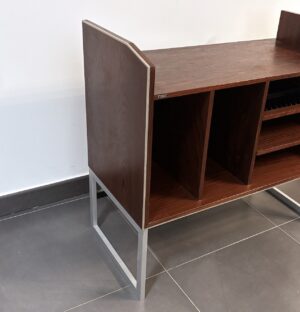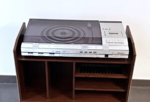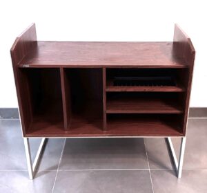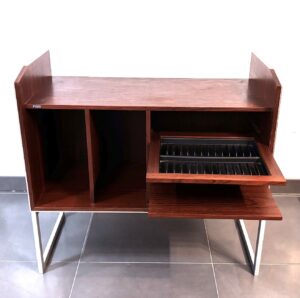 Con espacio para vinilos y diferentes estantes, entre los que destaca un estante especial para almacenar cintas de cassette.