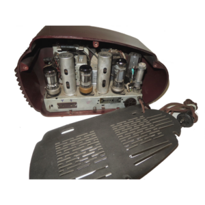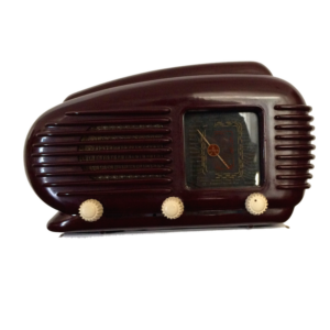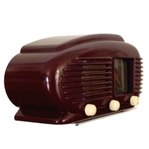 El acabado es en Baquelita. El color también se sale de lo habitual, porque las radios de baquelita solían ser negras o de color marrón oscuro. En este caso este color rojo oscuro (en muchos foros se llama color vino) la hace todavía más deseable.